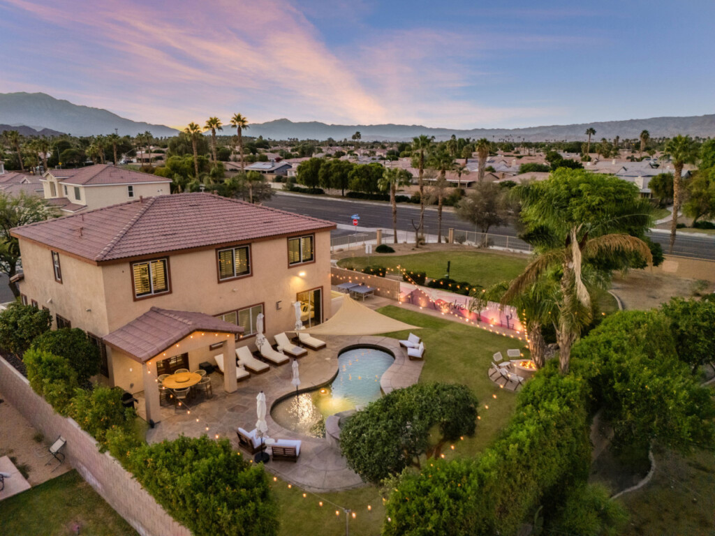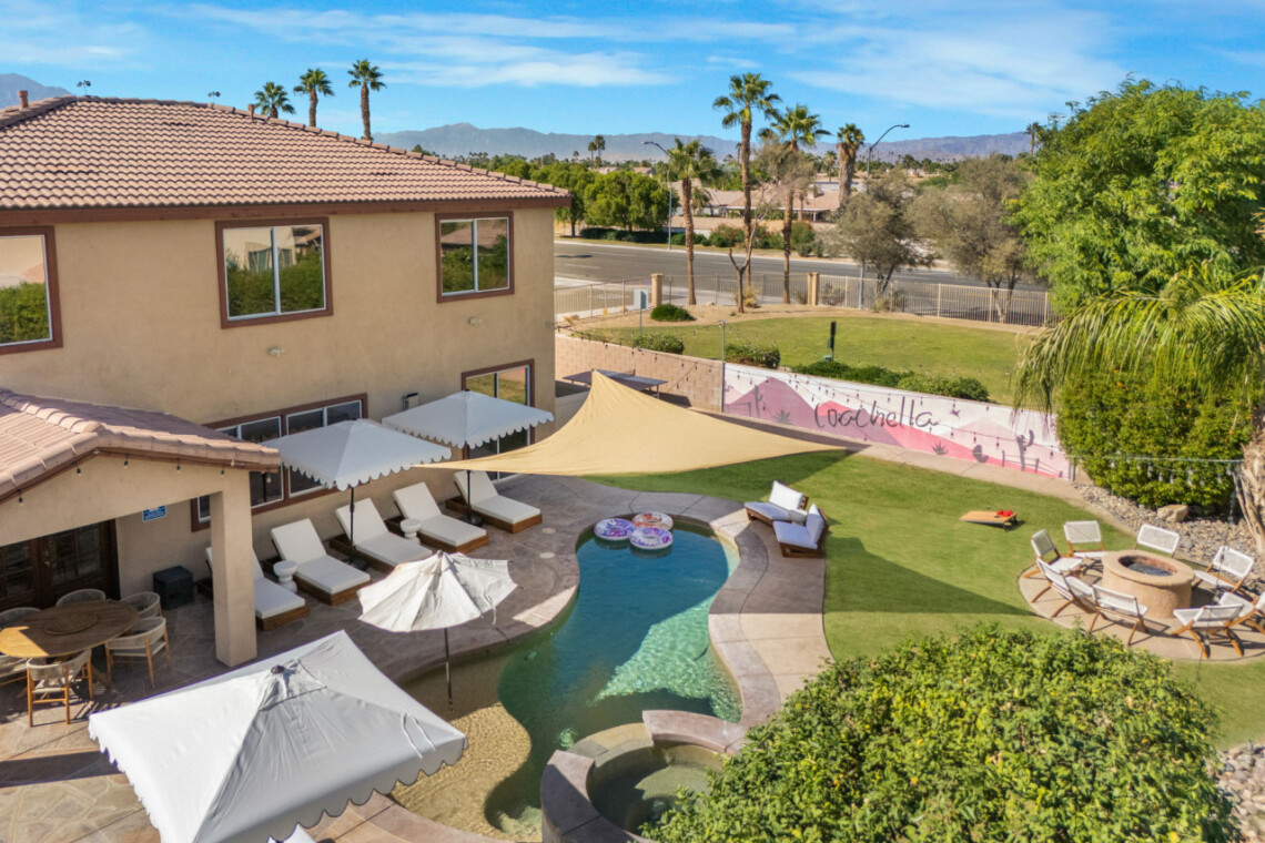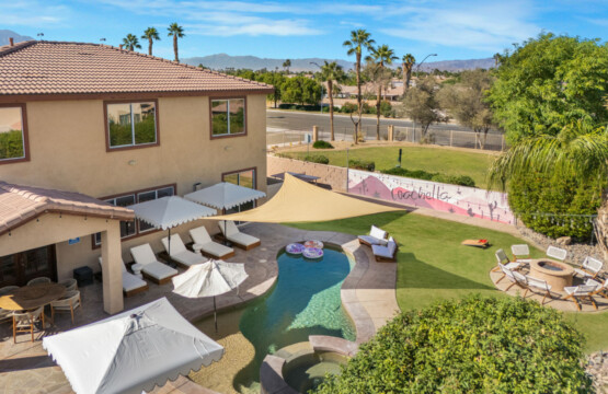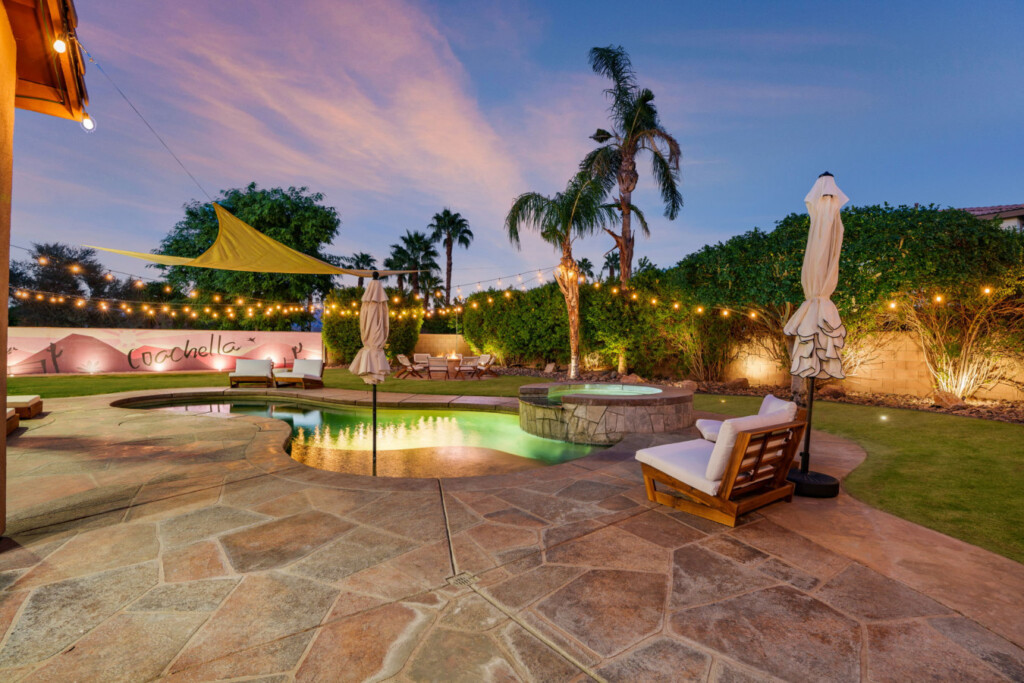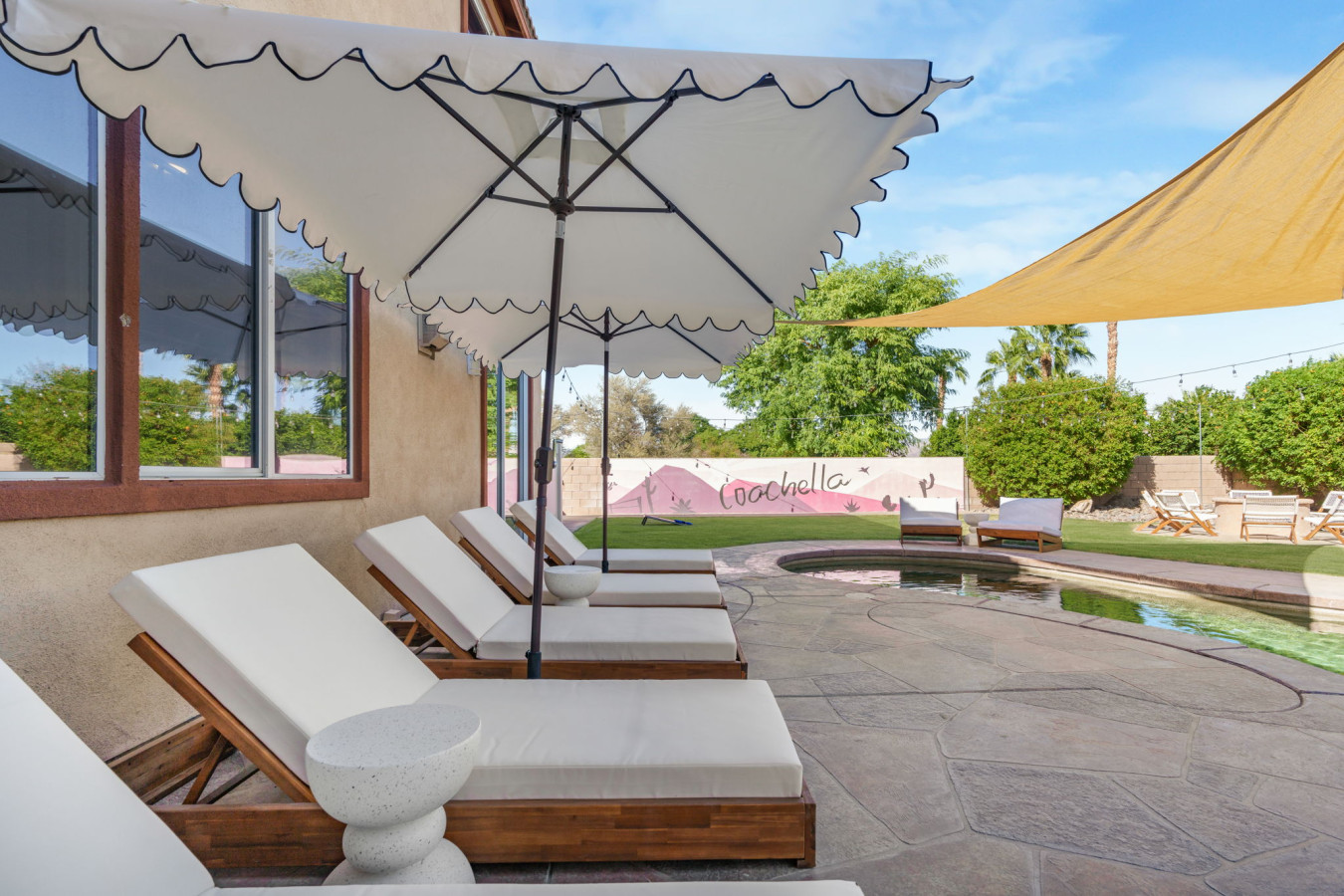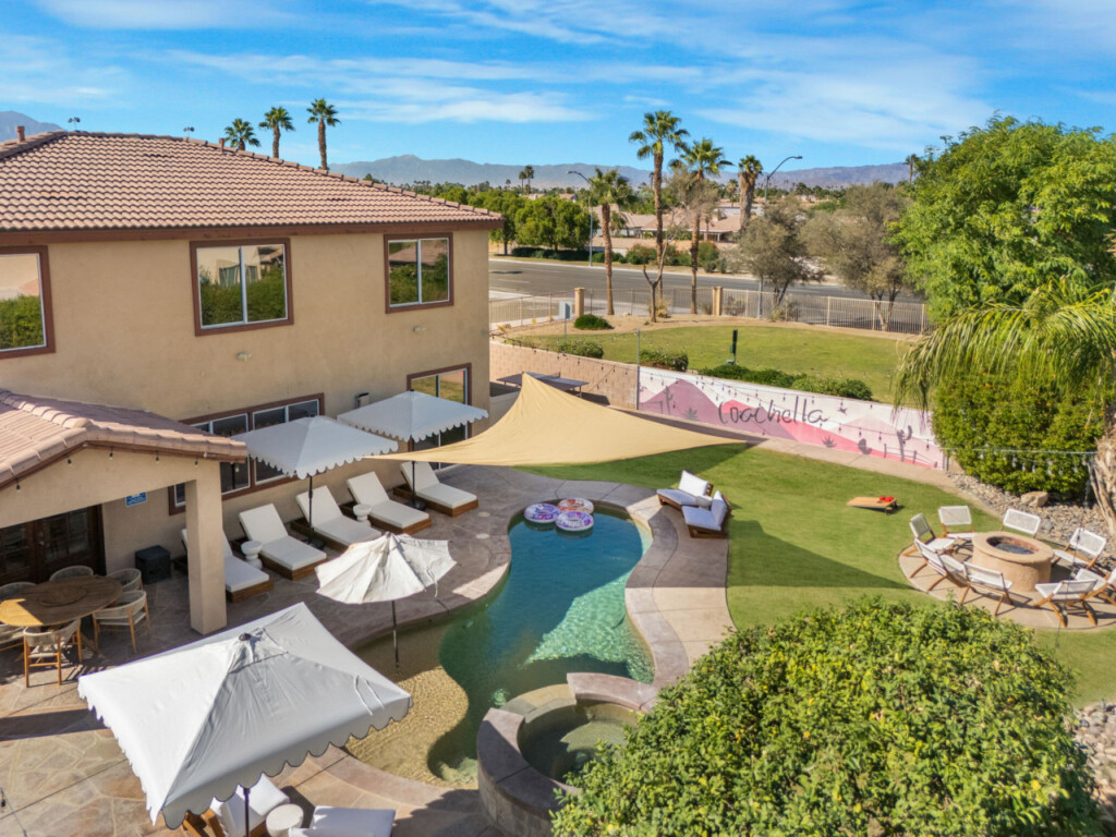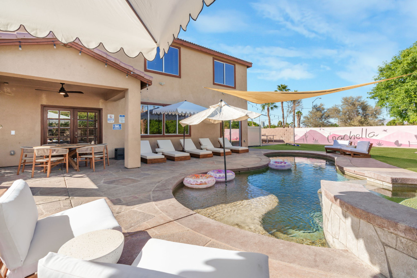 Shining from sunrise to starlight. Welcome to Coachella Sol Haus, a sun-drenched desert retreat made for connection, comfort, & unforgettable memories. This spacious 2 story home blends family-friendly warmth with resort-style amenities — the perfect base for festival weekends, golf getaways, or peaceful poolside escapes under the stars. Enjoy a heated pool, hot tub, firepit, string lights, games, & Insta-worthy mural. Inside: a chef’s kitchen, loft with 85″ TV, family amenities, & Tesla charger.