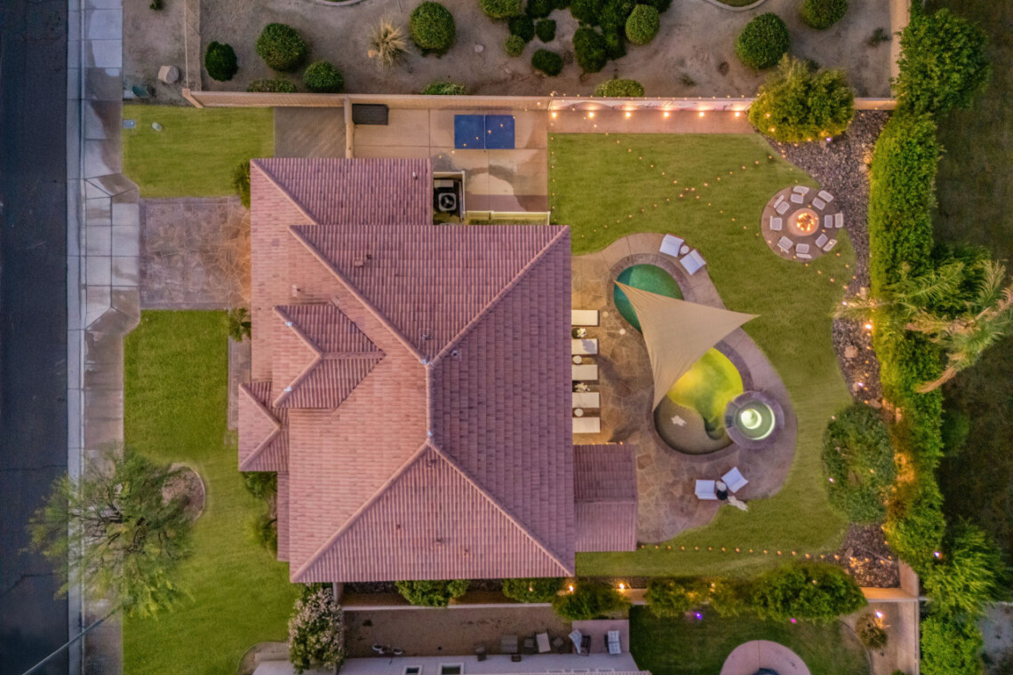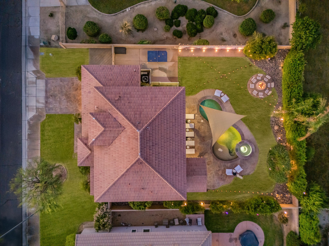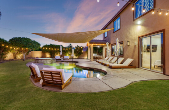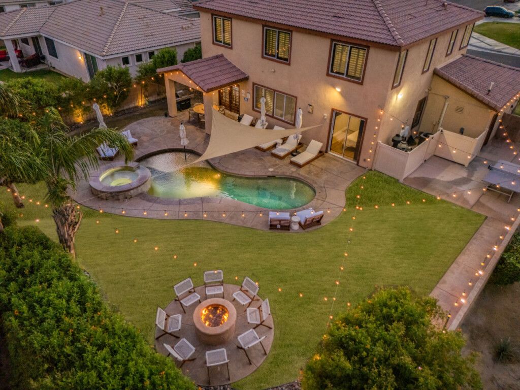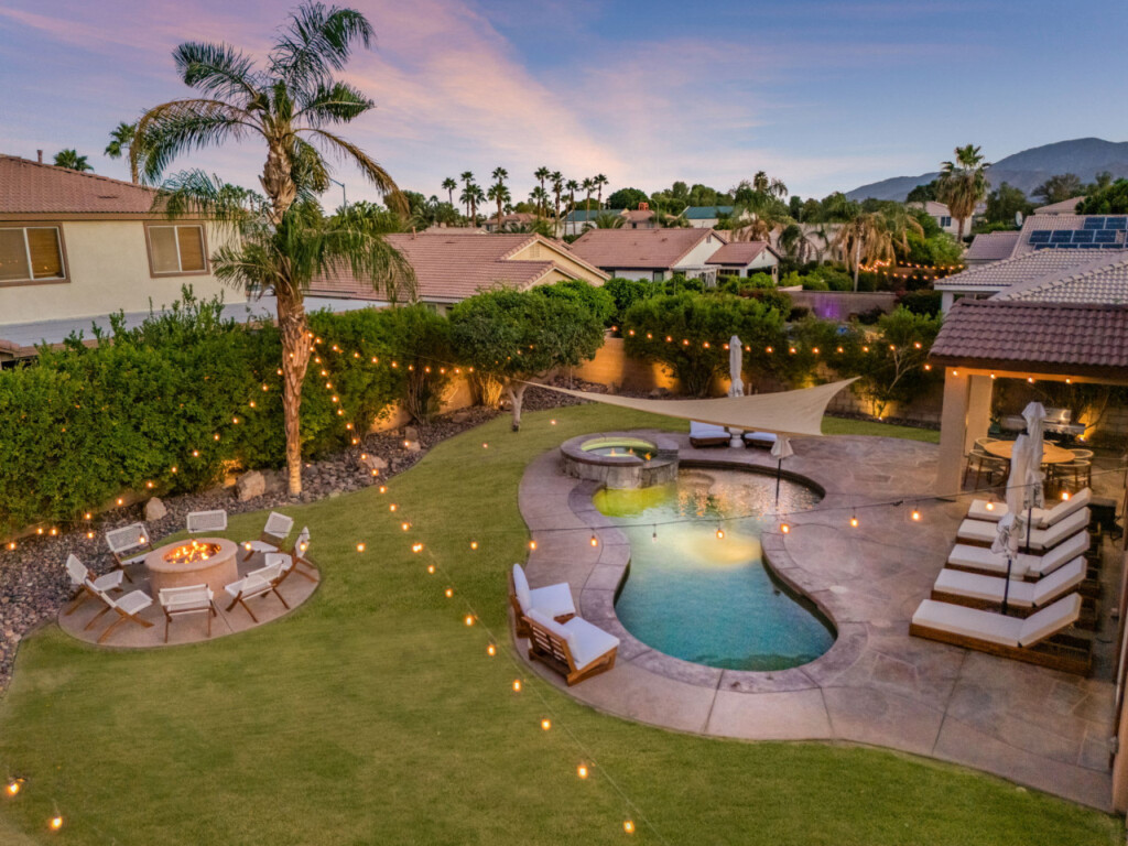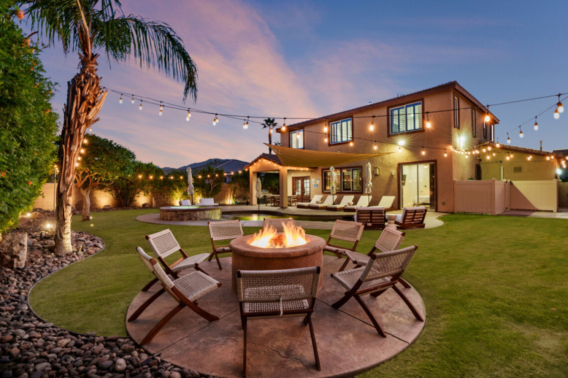 ☆ As the sun sets, the outdoor lighting transforms the yard into a glowing desert dreamscape, perfect for evening cocktails or soaking beneath a canopy of stars.