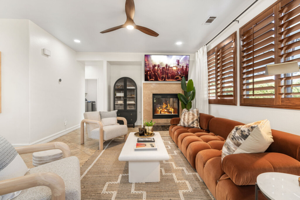 ☆ The living room features comfortable seating, a Smart TV, and a decorative fireplace, for ambiance only (currently non operational).