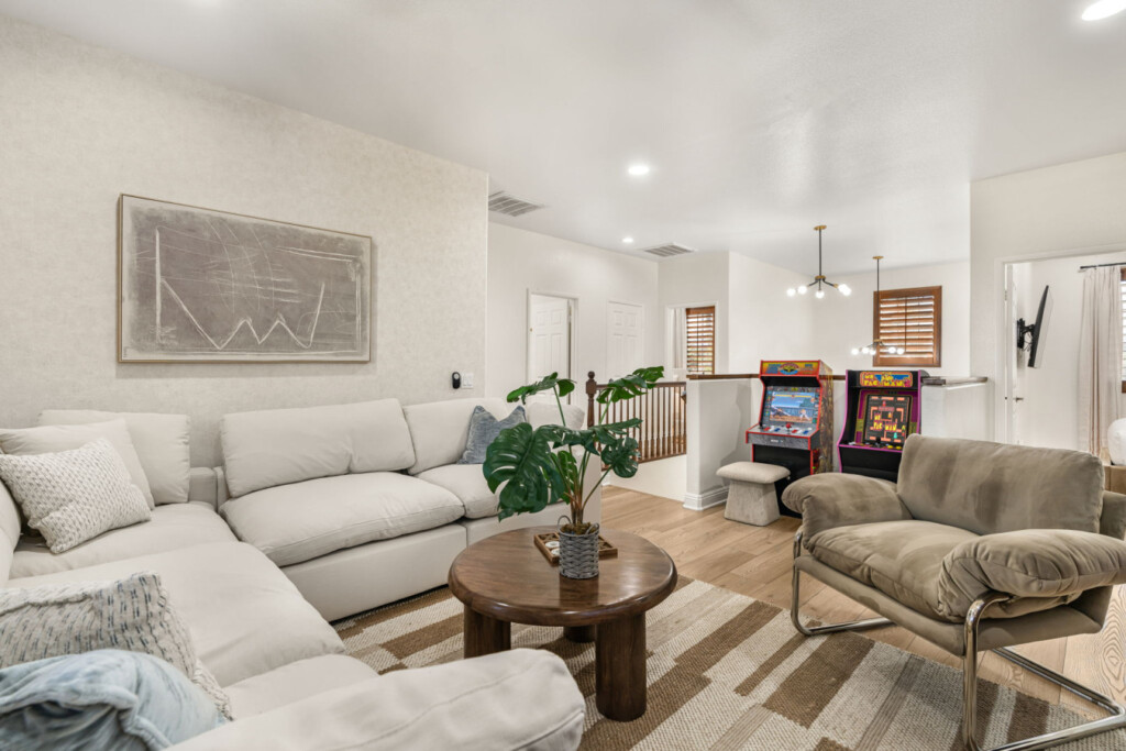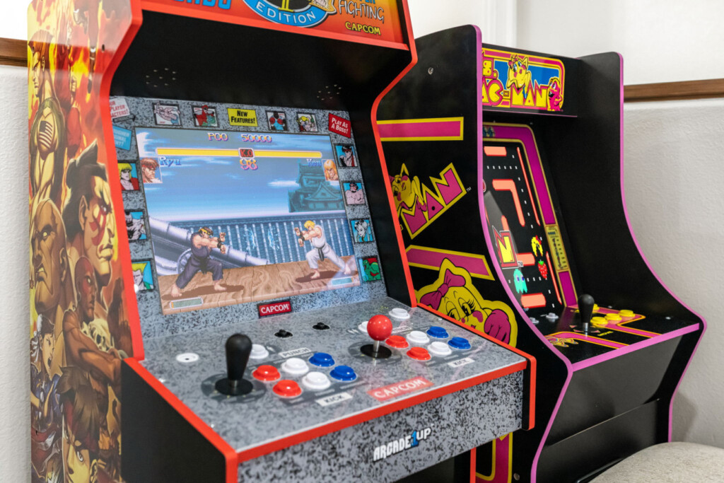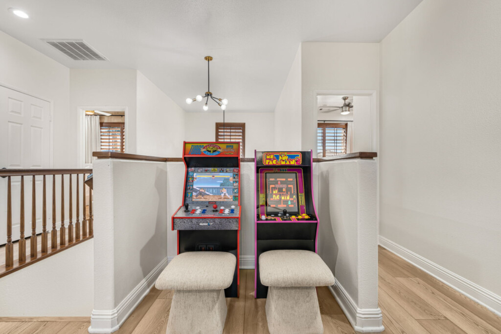 ☆ Upstairs Loft: The loft lounge invites you to relax on cozy couches, enjoy the 85” Smart TV, 2 arcade game consoles including Street Fighter 2 and Mrs Pac Man and play classic board games like UNO, Monopoly, Life, Clue, Candy Land, Chess, Connect 4, and Jenga.