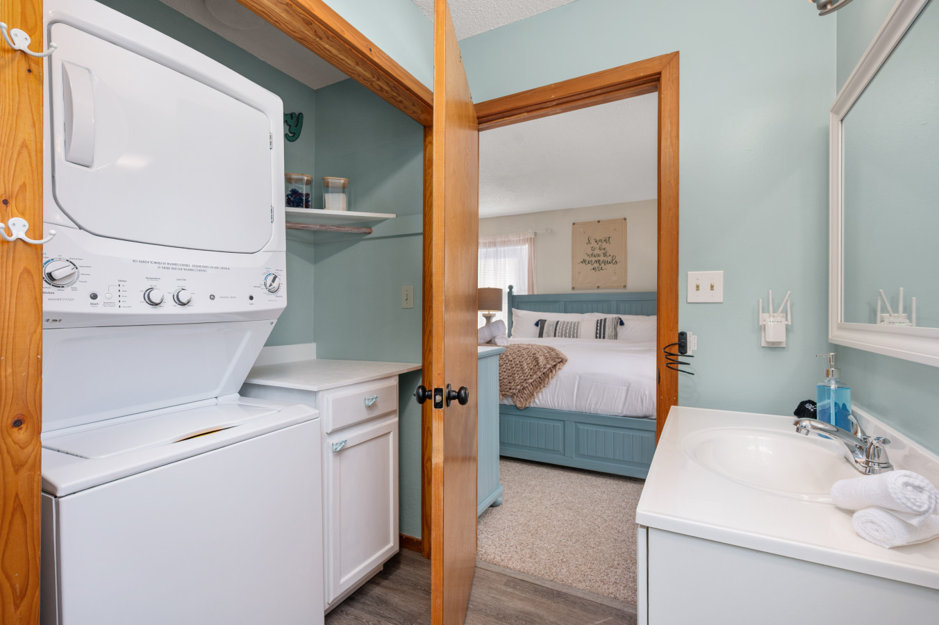 – This level also includes a hallway bathroom, a washer and dryer, an iron and ironing board, a first aid kit, and a hair dryer for guest convenience.