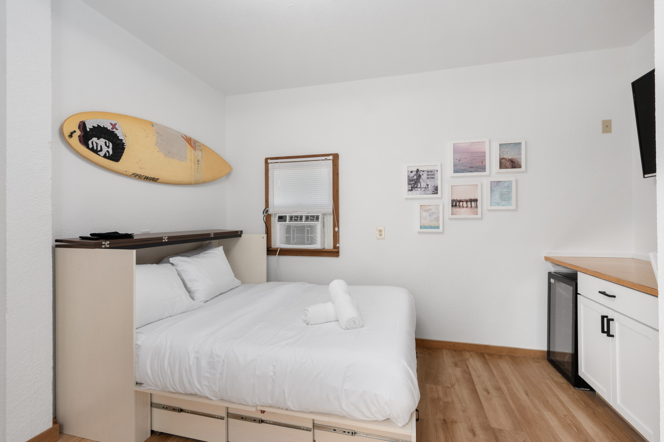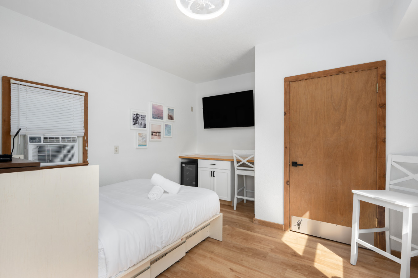– This suite includes a queen Murphy bed that is always open and ready for use, a private half bathroom (with toilet only), a TV, a clothing rack, and a desk space with a mini refrigerator.