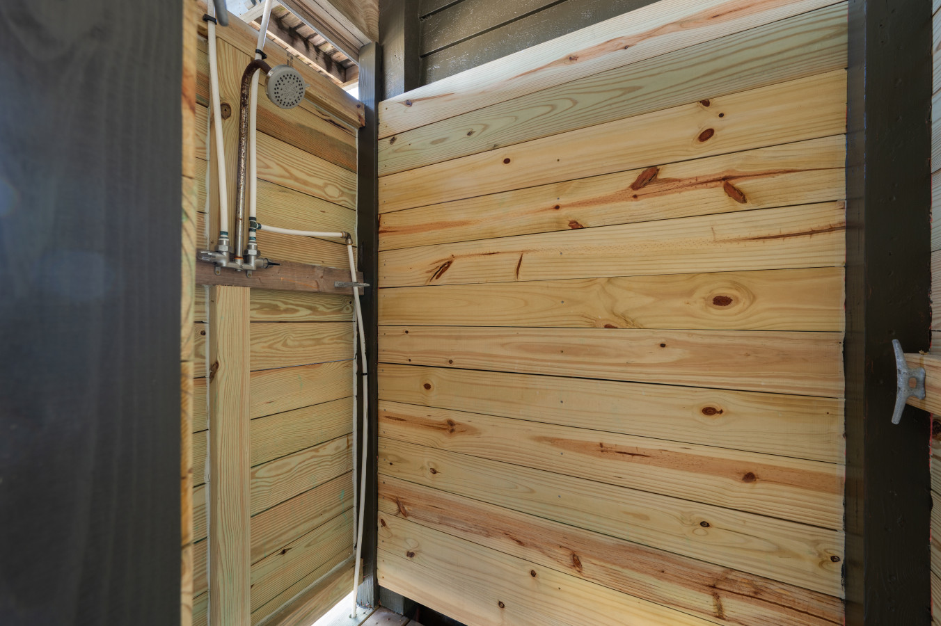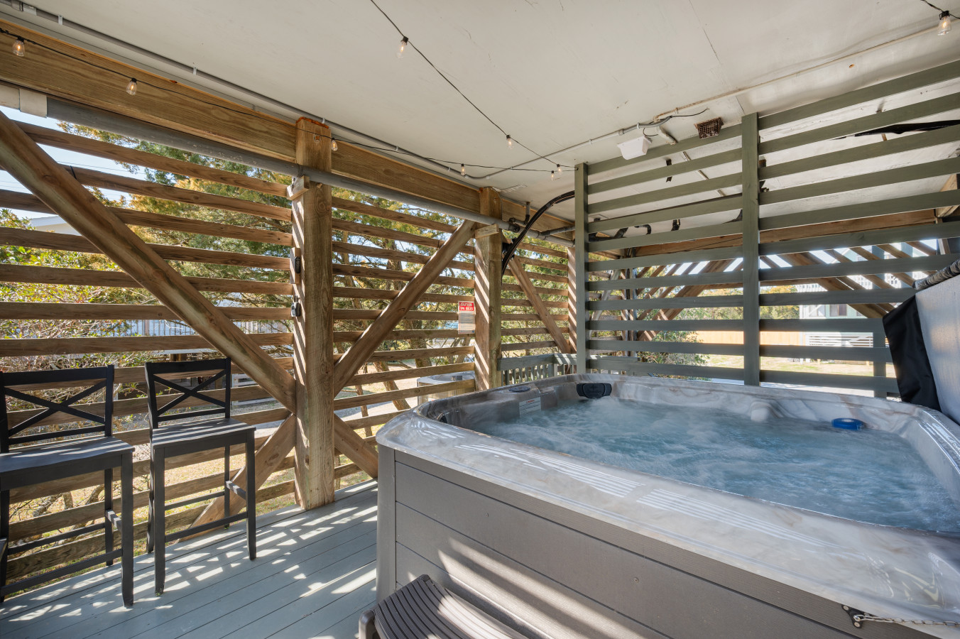 – Guests can unwind in the private hot tub, enjoy the convenience of the outdoor shower for rinsing off sand after the beach, or gather outside for meals at the picnic table under string lights.