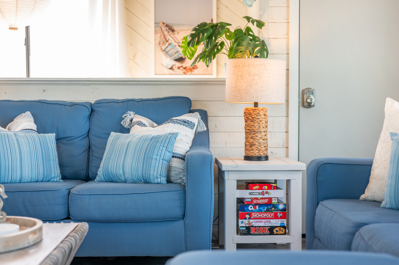 – The living room features comfortable seating, a 50-inch Smart TV where guests can log into their own streaming apps, and a large collection of DVDs, puzzles, and classic board games for evenings indoors.