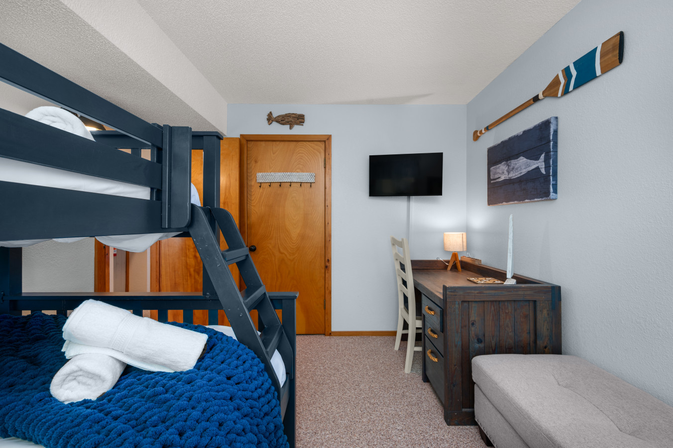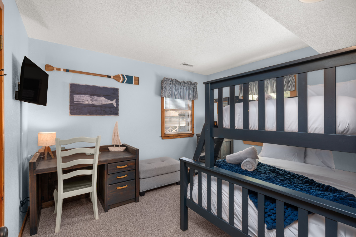 – Bedroom 2: The second bedroom includes a twin-over-full bunk bed, a Smart TV, and a dedicated workspace with a desk, ideal for children or guests working remotely.
