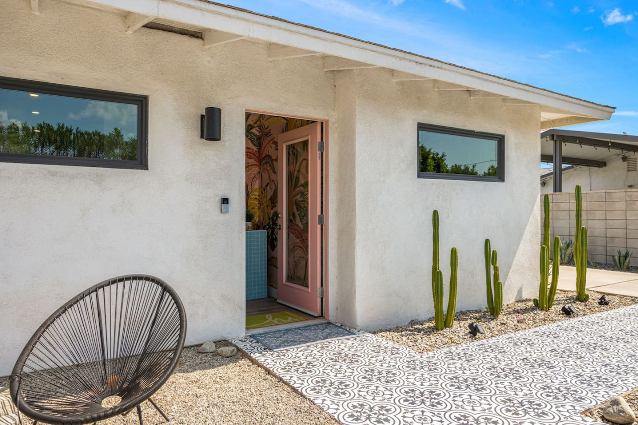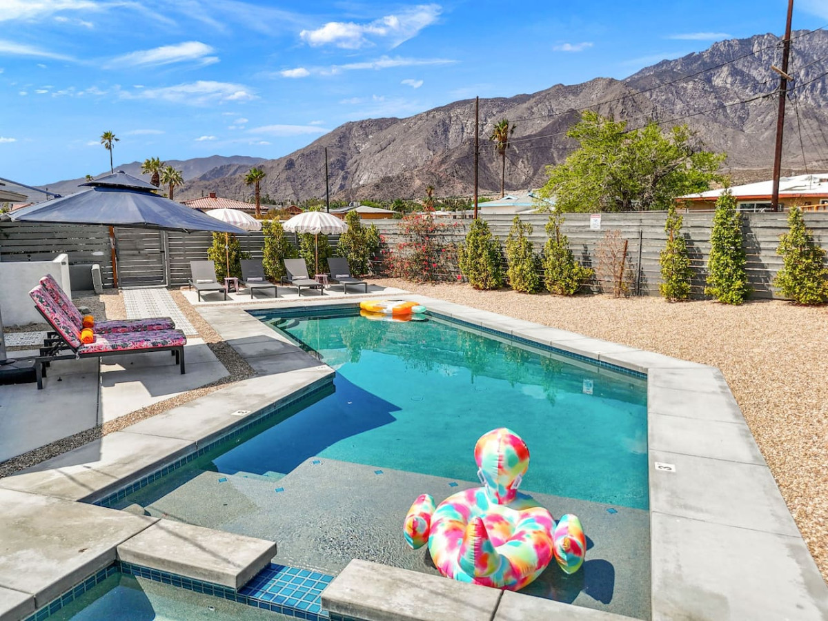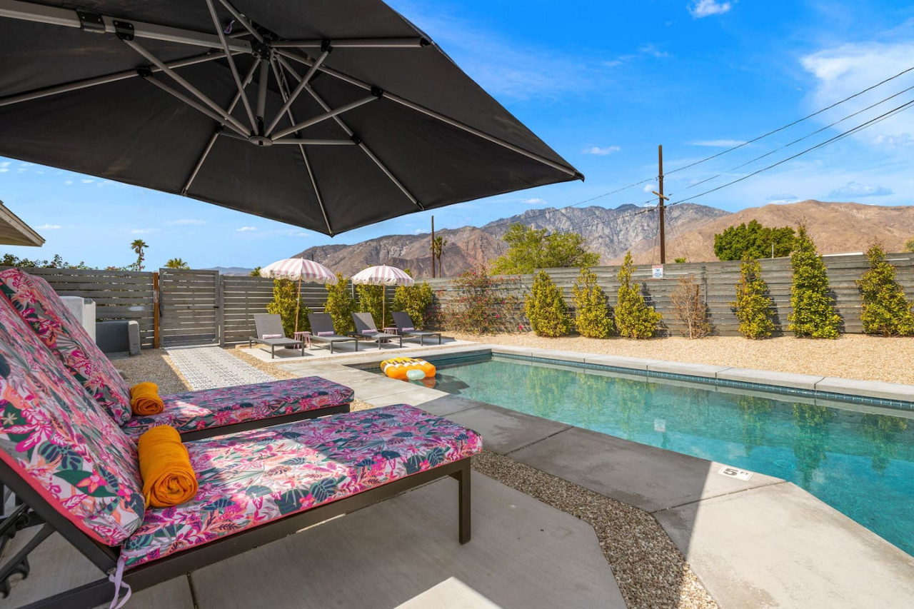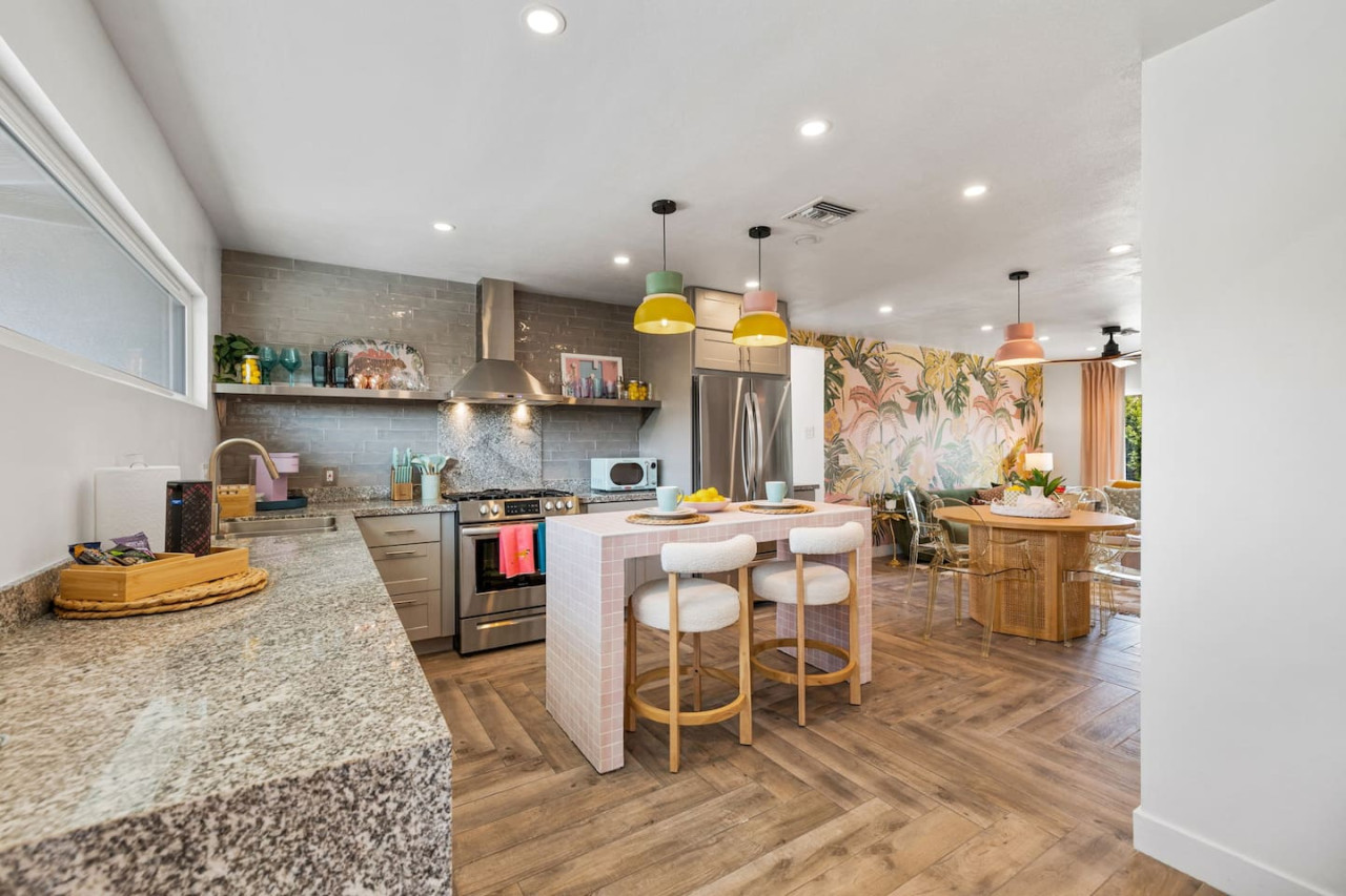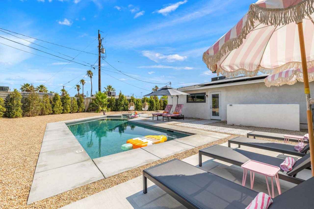 Celebrate your special moments at the Whimsical Oasis Retreat. - Vibrant floral decor and pink accents create a fun atmosphere. - Heated L-shaped pool with spa-side hot tub and outdoor dining for 6. - Three comfortable bedrooms, including a master with en-suite. - Smart home features for optimal comfort. - Family and pet-friendly amenities ensure everyone is welcome. - Only 3.5 miles from downtown Palm Springs. - Highly recommended by previous guests! Celebrate your special moments at the Whimsical Oasis Retreat in Palm Springs, CA, the perfect destination for bachelorette parties and birthday celebrations. This beautifully decorated home features floral wallpaper and pink accents throughout, creating a fun and vibrant atmosphere that will make your stay unforgettable. Maximum occupancy is 6 overnight guests ages 13+ and 2 guests 12 and under (total of 8 guests), per city regulations. Outdoor Bliss: - Heated L-Shaped Pool: 12ft x 36ft, depths up to 5ft, with spa-side controlled hot tub. Enjoy pool floats and evening oasis with pool and hot tub lights. - Sun Lounge Area: Equipped with 6 sun lounge chairs, umbrellas, a sectional sofa, and a fire pit for relaxation and socializing. - Outdoor Dining & BBQ: Propane BBQ with utensils and…